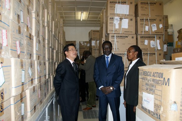 杨大使和乍得卫生部长一起查看我援乍的抗疟药品