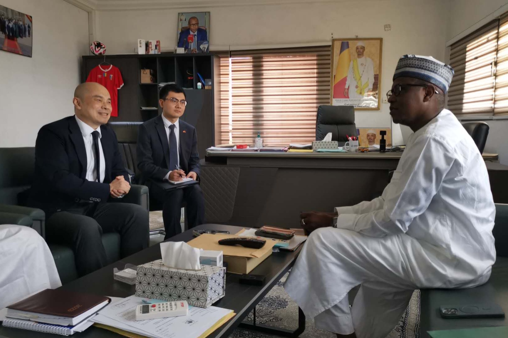3月25日,驻乍得大使王晰宁会见乍工业与贸易部部长阿卜杜勒卡里姆,乍国家工商会主席阿吉、使馆经商参赞陈霄等在座。